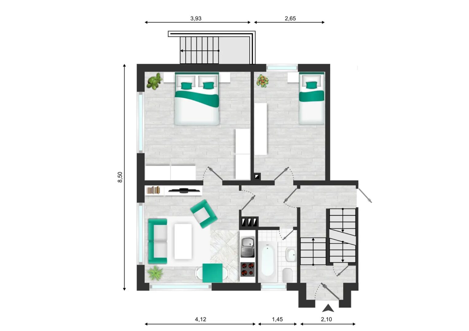Im Erdgeschoss erwartet Sie ein offen gestalteter Wohn- und Essbereich, eine separate Küche sowie ein Duschbad komplettieren diese Ebene. Über eine Wendeltreppe gelangen Sie in das Obergeschoss, wo sich ein Durchgangszimmer zur Diele öffnet. Von hier aus erreichen Sie das Arbeitszimmer, ein Wannenbad sowie das Schlafzimmer, welches durch das Arbeitszimmer zugänglich ist.